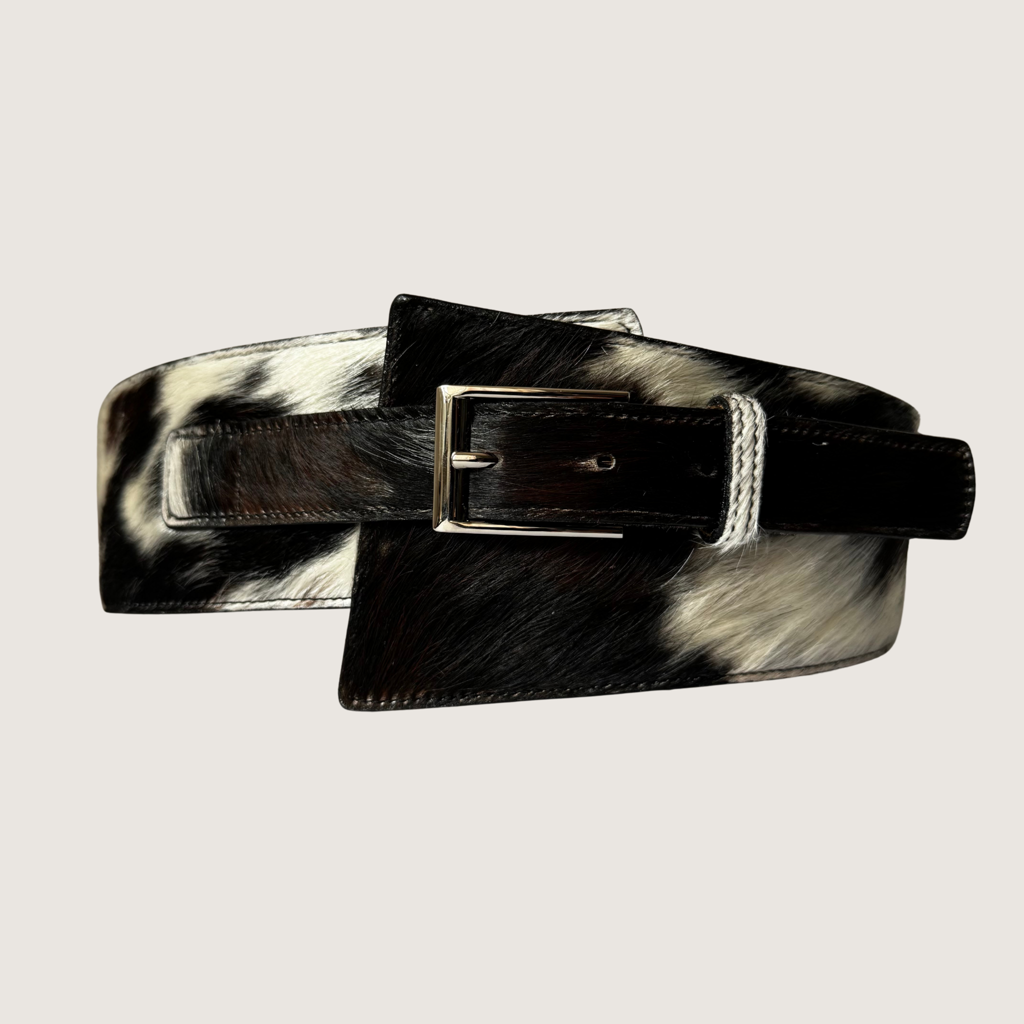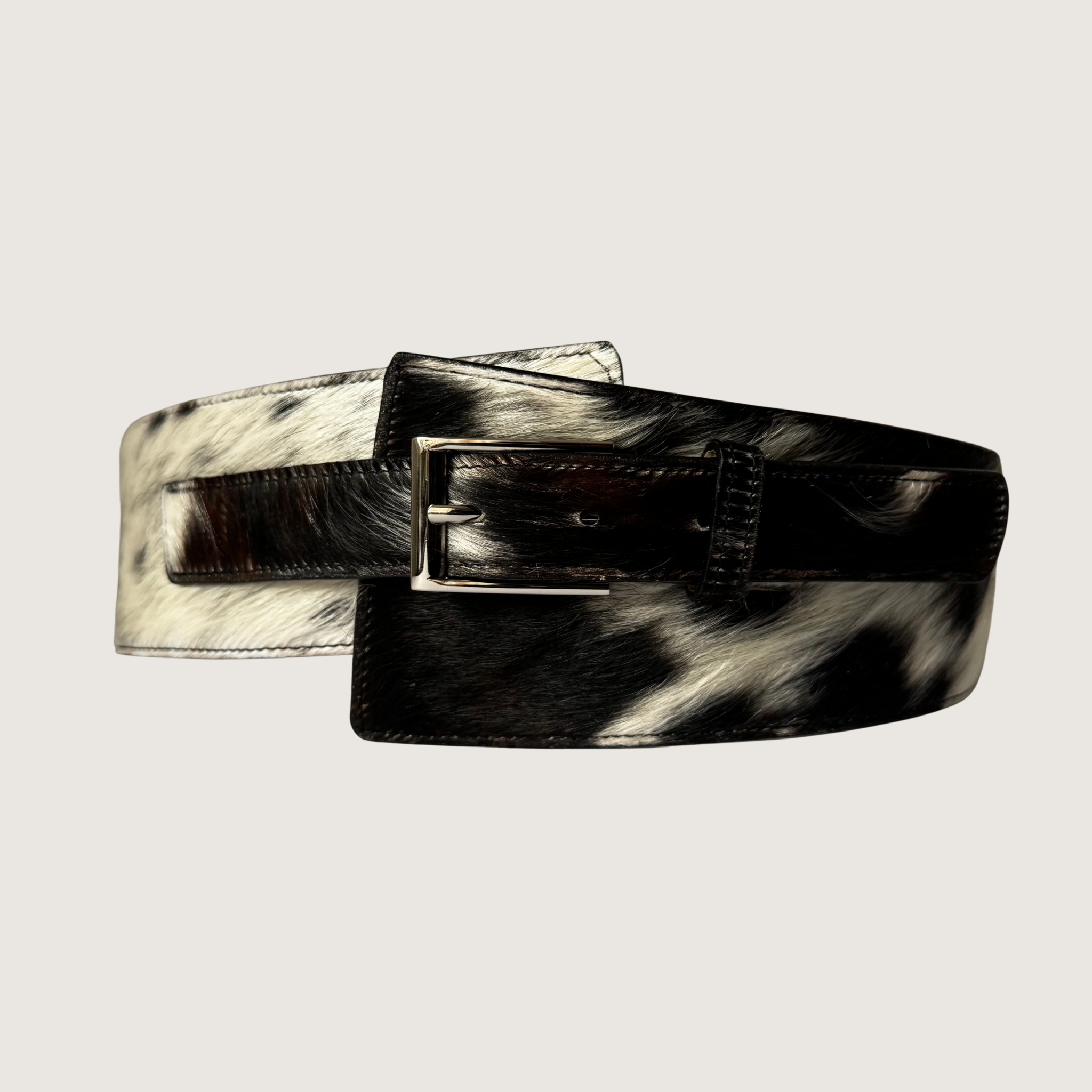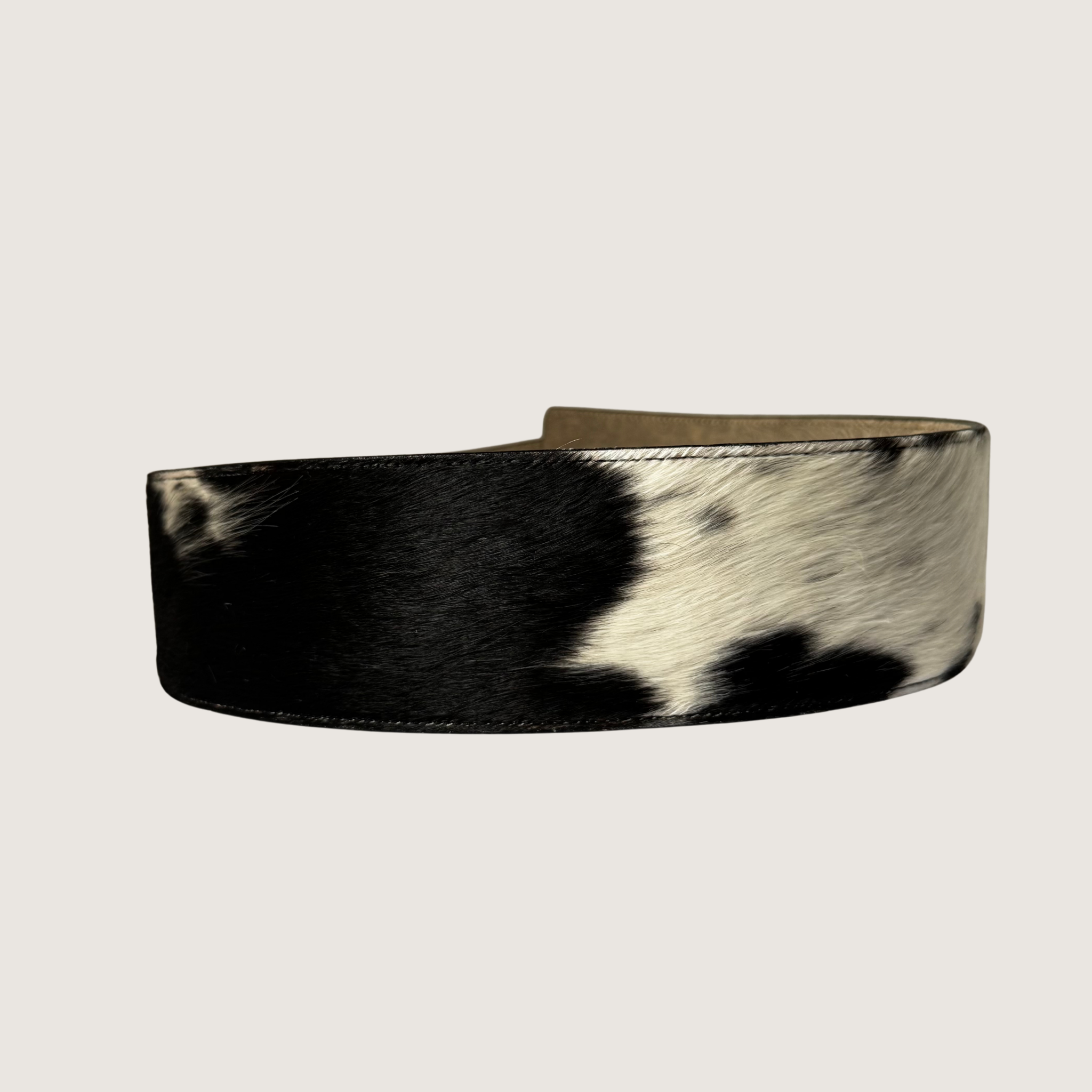 Dale un toque único a tus outfits con este cinturón para mujer tipo fajón, elaborado en 100% cuero de pelo, con un diseño en tonos Blanco y Negro que resaltan su textura natural.