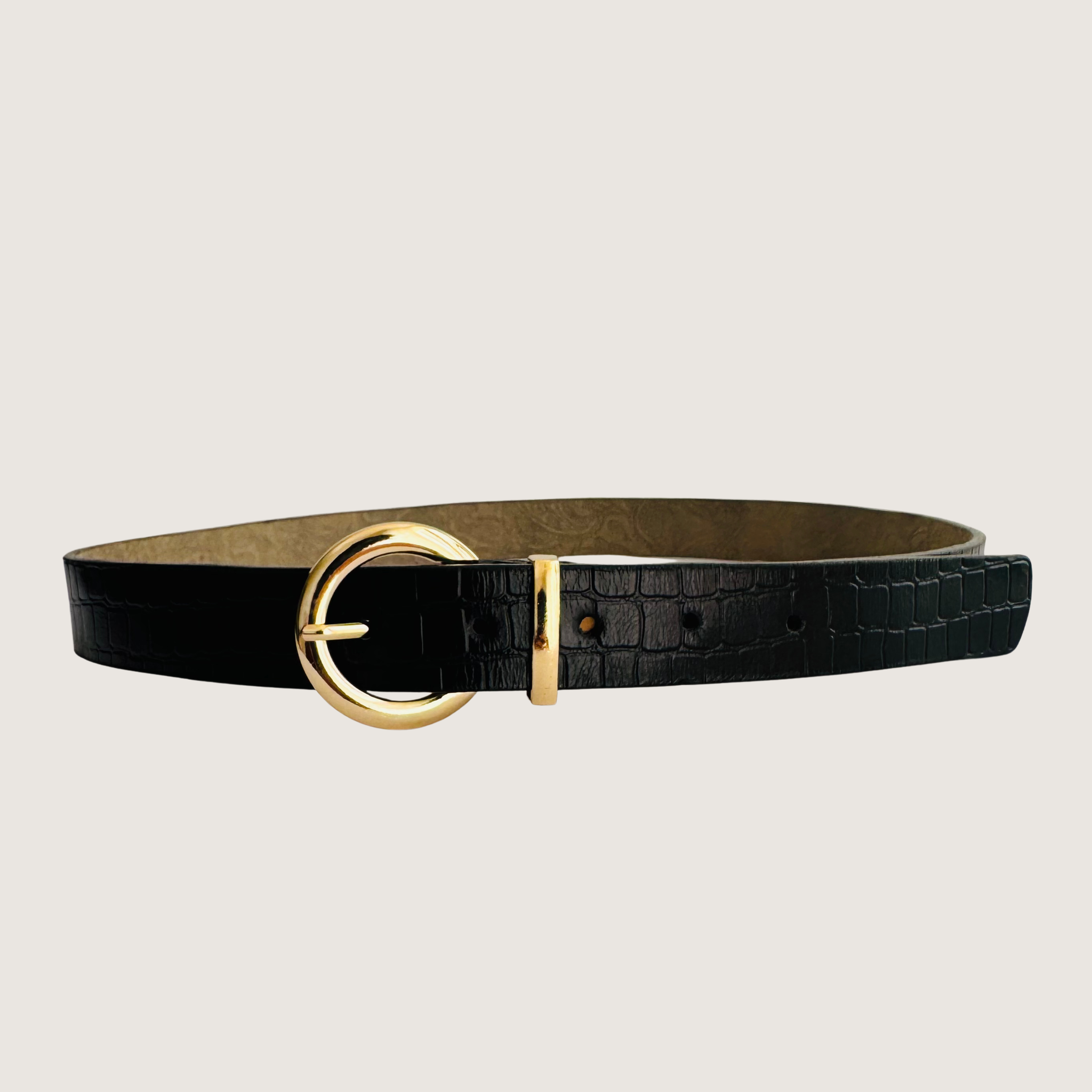 Un básico imprescindible: este cinturón para mujer combina la elegancia y calidad del cuero genuino con una textura cocodrilo y una hebilla que le da un toque moderno. Perfecto para elevar cualquier outfit, desde jeans clásicos hasta looks más formales y elegantes.